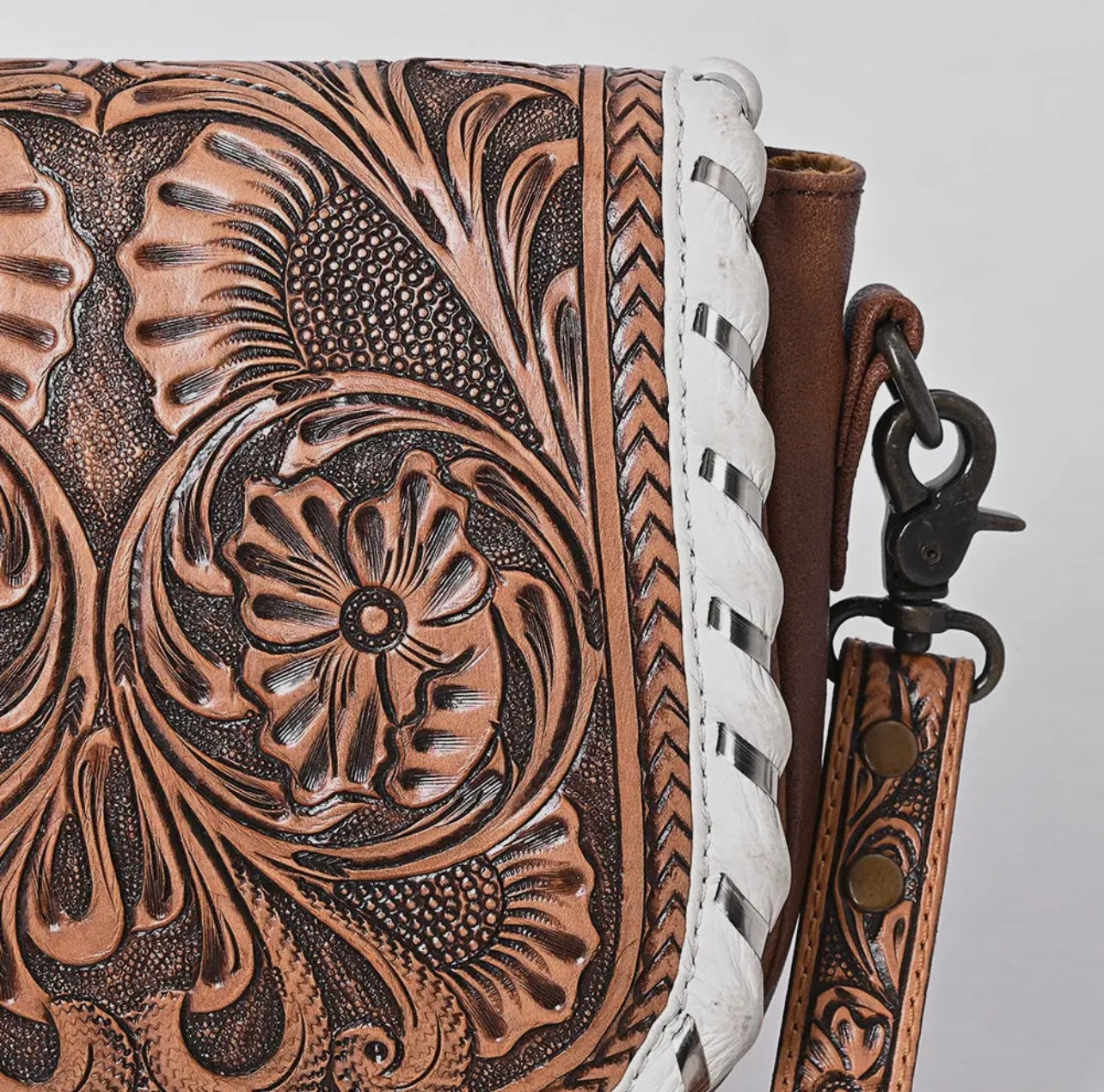 The shoulder strap is adjustable and made of 100% genuine vegetable tanned Cowhide Leather with a hand tooled pattern.