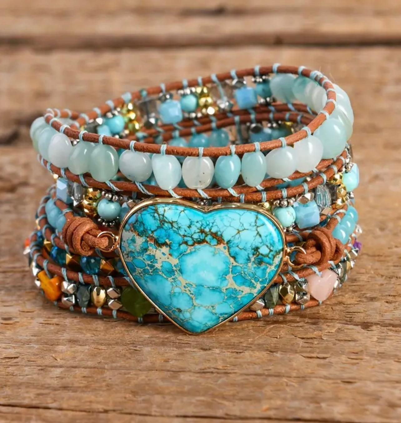 The turquoise bohemian bracelet is absolutely stunning with an array of earth tone beads, intricate weaving, and a gorgeous turquoise heart pendant.